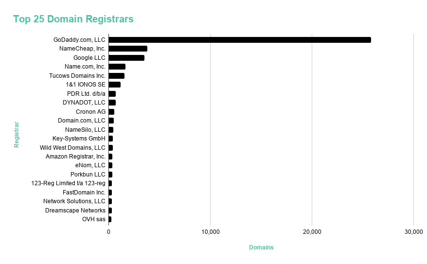 Figure 2: Top 25 domain registrars used to register COVID-19 themed domains.