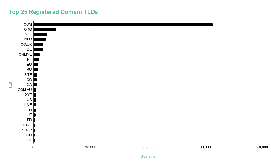 The graph above shows new domain registrations by day. The first small spike on the graph on February 11 reflects the date the World Health Organization named the virus COVID-19 (829 new domain registrations). The graph also reflects an increase in registrations starting around the last few days of February, a time when cases in Europe started to accelerate and newspapers began reporting initial infections in new countries around the world. The chart’s most dramatic spike in domain registrations was on March 12th, the day before President Trump declared a national emergency in the United States (from 1,715 cases on March 11 to 3,305 on March 12). The New York Times has summarized the progression of events within this timeline.