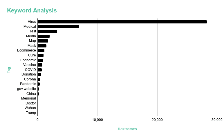 Given the confusion and uncertainty surrounding testing, it’s also unsurprising to see that “test” ranks as the third most popular keyword. Our researchers noted a small spike in domains using this keyword after President Trump gave a speech promising additional testing.