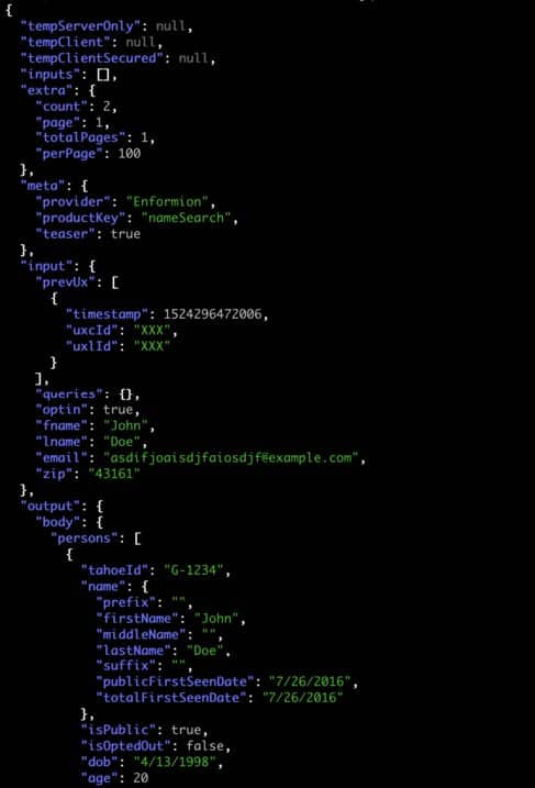 Based on the formatting shown in image 5, we suspect that MC2 may have obtained the data in the input objects from data lookup requests that their customers made and at least some of the data in the output objects from querying Enformion’s API products. The results appear to include the results of various search queries. We hypothesize that MC2 makes multiple requests against various data search APIs for each person that plausibly matched the search term.