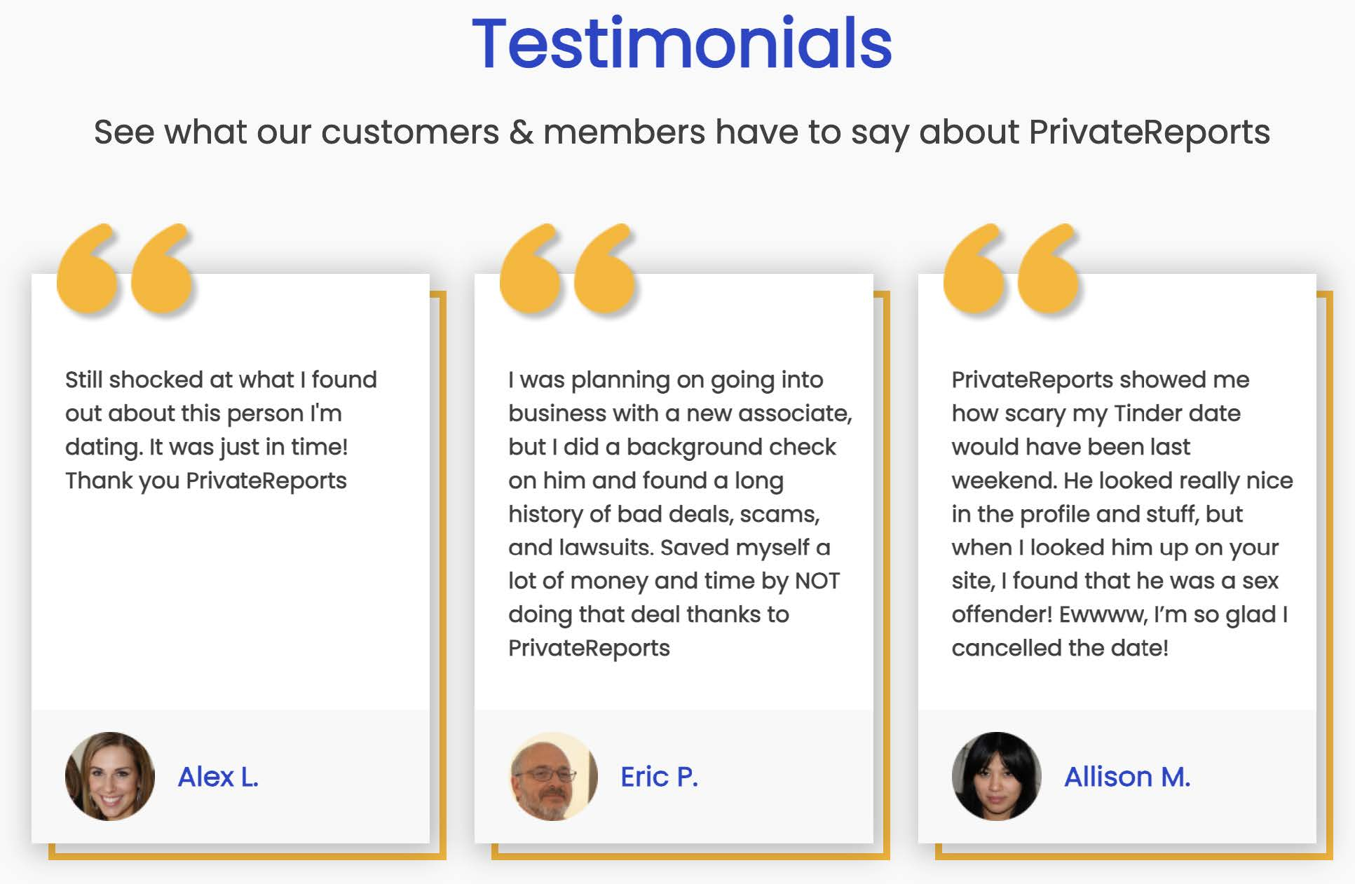 Image 4: Testimonials from the PrivateReports website showing consumer use cases such as looking up romantic interests.