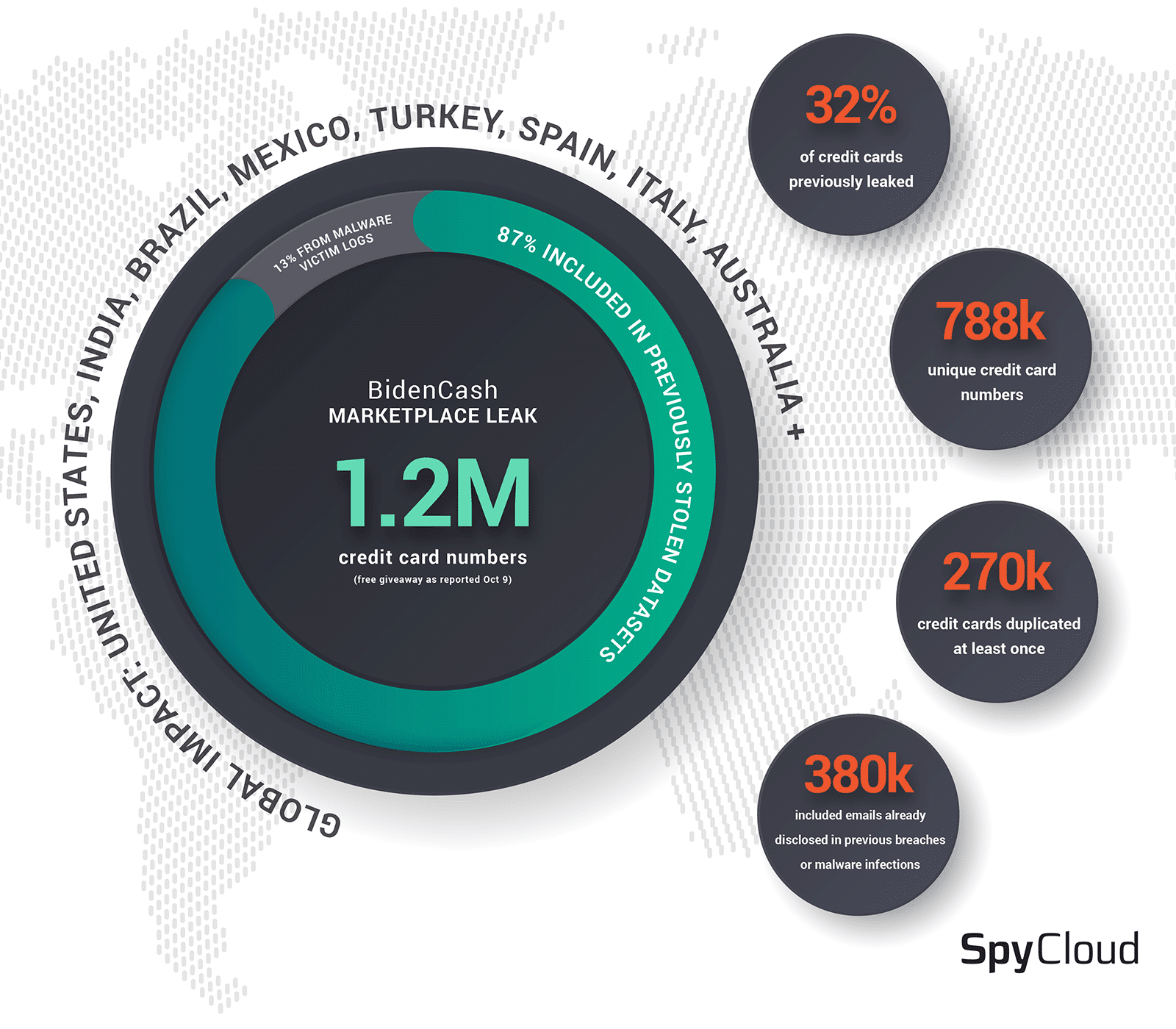 Researchers at SpyCloud conducted an analysis of the BidenCash dump by comparing the information – namely, credit card numbers, email addresses, and phone numbers – against the SpyCloud datalake of approximately 280 billion recaptured breach and malware records, in an attempt to determine potential sources of the information and confirm the authenticity of the records contained therein.