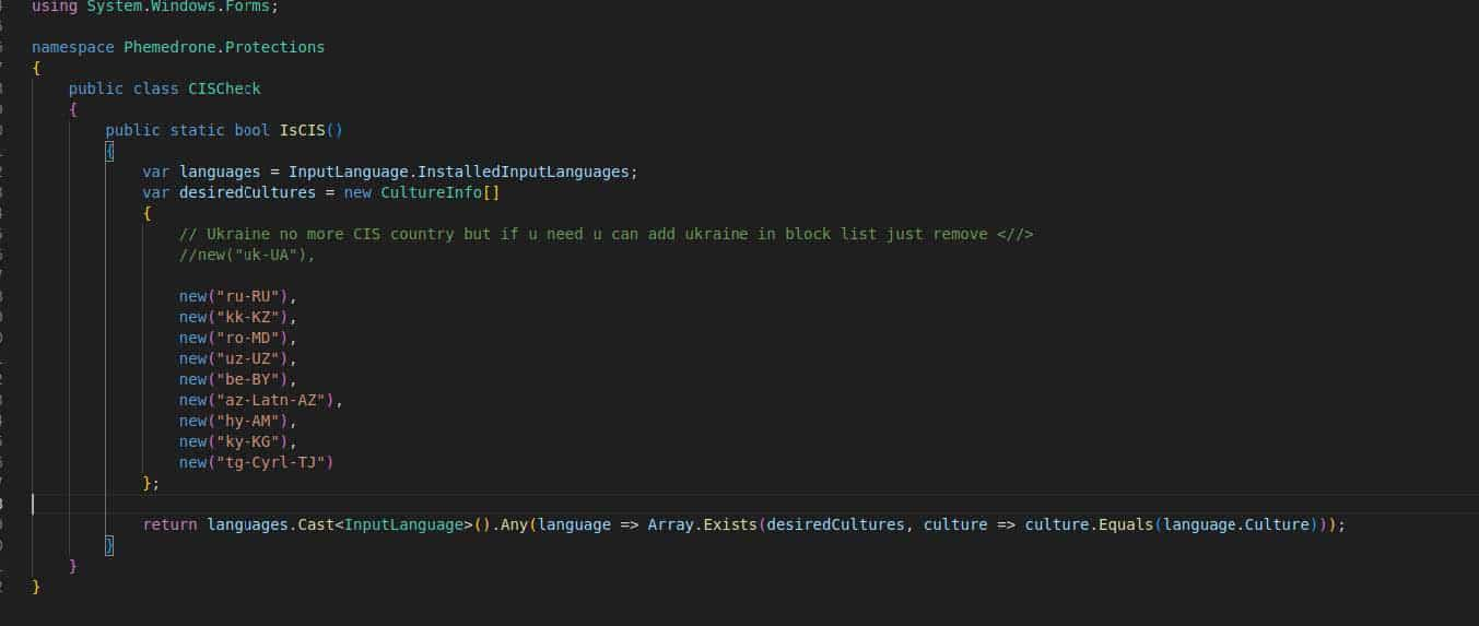 Phemedrone has a check that checks if a victim is a speaker of the following languages spoken in Commonwealth of Independent States (CIS) countries, by using a keyboard language check, as observed in Image 4:
