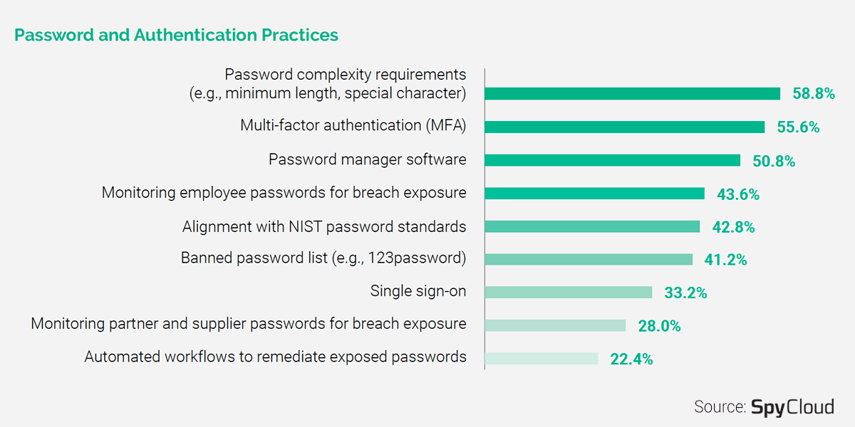What astounded us from the survey is that 41% of organizations don’t have a password complexity requirement, which is the easiest and least costly form of password security. And only 56% of organizations have implemented multi-factor authentication (MFA). Stolen credentials being a significant enabler of successful attacks, our report highlights ways to prioritize effective defenses to prevent account takeover and other forms of credential compromises.
