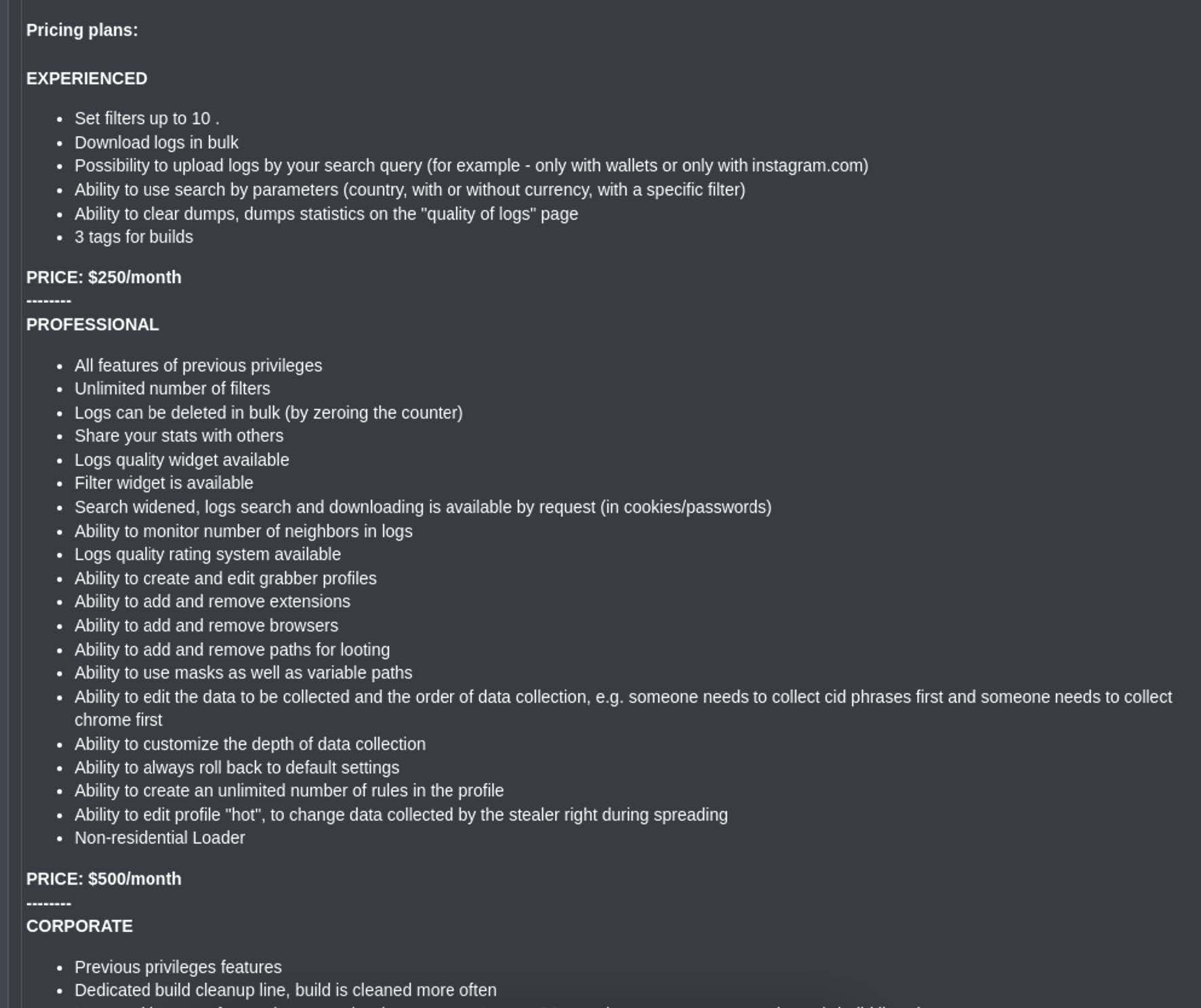 As observed here, LummaC2 offers a monthly pricing scheme of Experienced ($250/month), Professional ($500/month), and Corporate ($1000/month), with a variety of features offered for each tier.