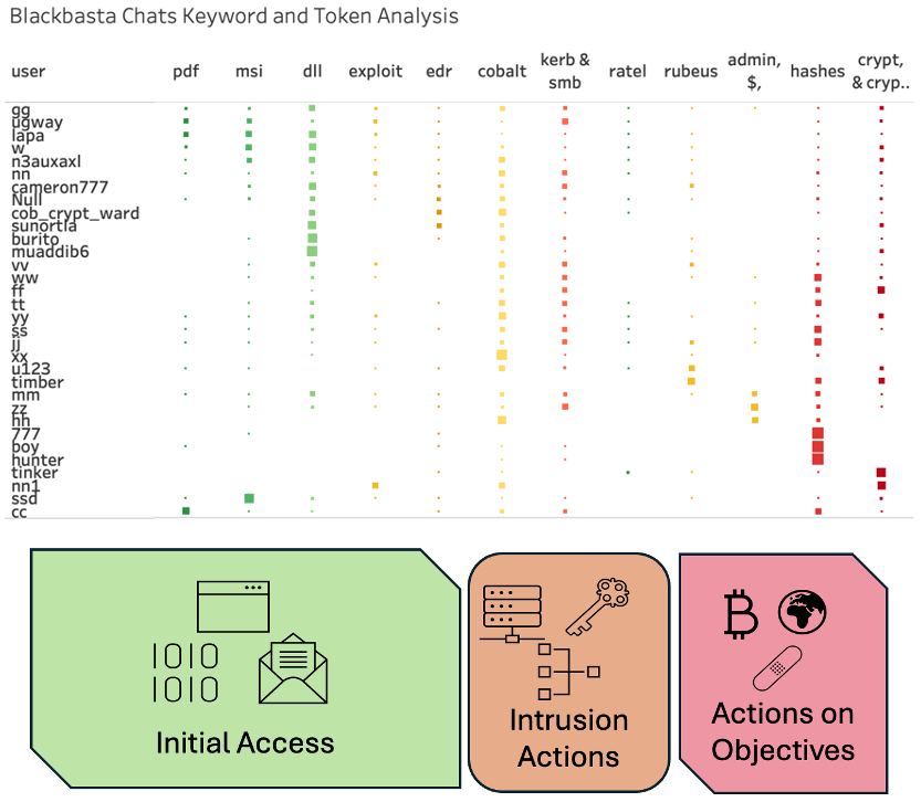 Our ad-hoc token clustering analysis on the leaked Black Basta chats, integrated with ground truth and a bit of RUMINT, illustrates the potential roles of some key members of the Black Basta operation (image 5). Key tokens are loosely aligned along the kill chain, demonstrating some fuzzy grouping of the members from initial access to actions-on-objectives. More thorough, qualitative analysis on each member was performed by an independent security researcher, bencrypted.