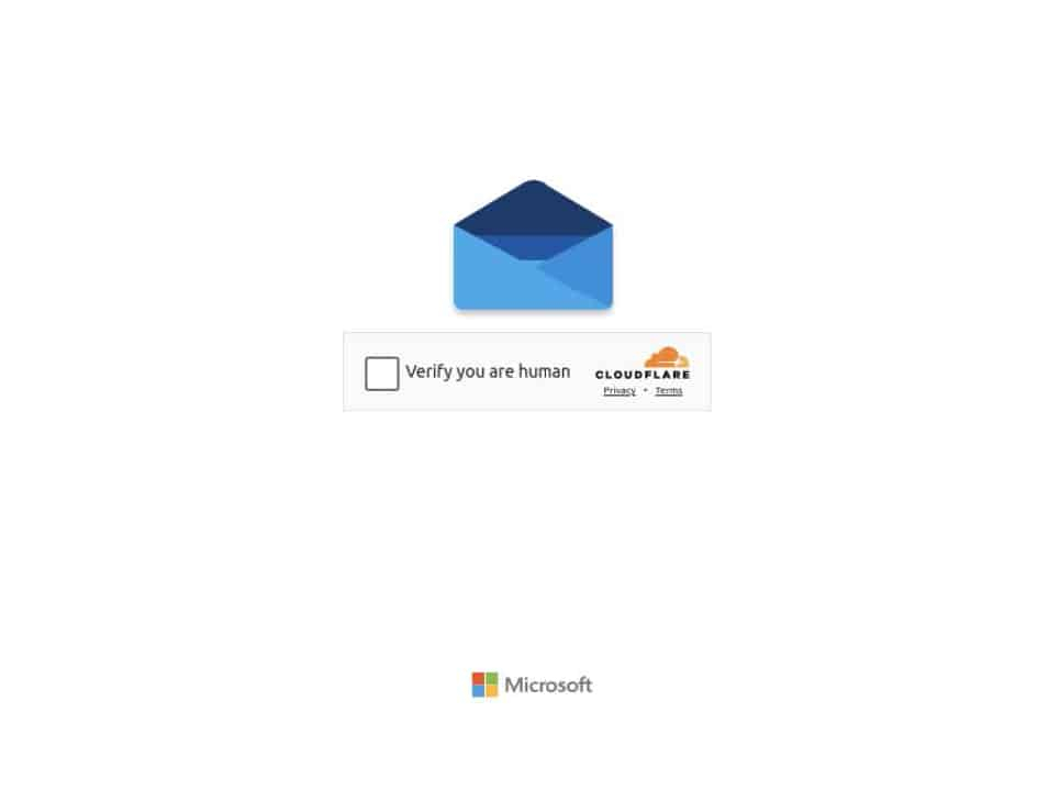 Screenshot of an initial phishing landing page crafted with ONNX. It shows the use of Cloudflare’s legitimate anti-bot CAPTCHA service. It also contains a Microsoft logo and the Outlook blue envelope logo, indicating that this page is intended to phish Microsoft Outlook account credentials from victims.