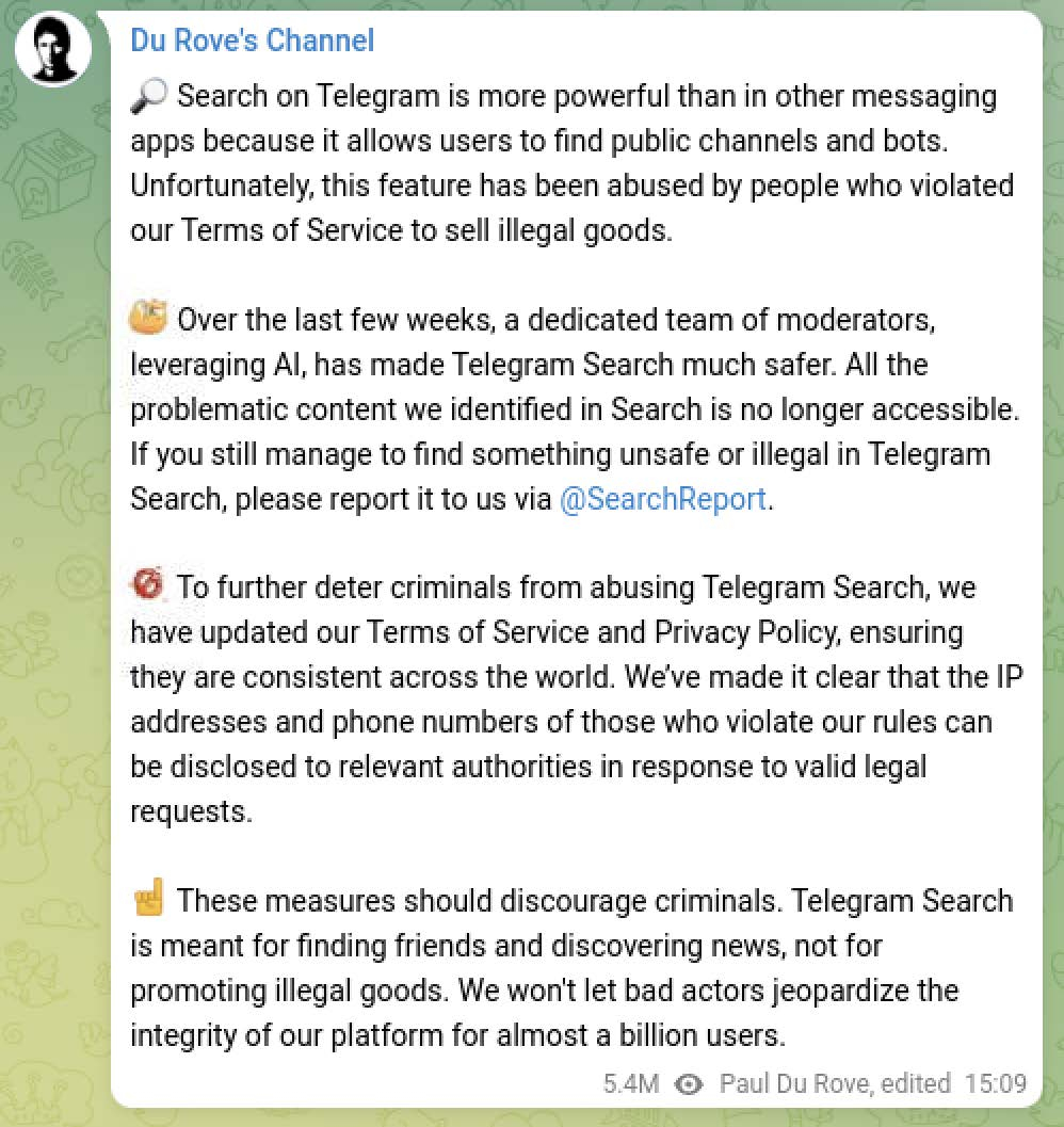 In late August, Pavel Durov, the CEO of Telegram, was arrested in Paris for allegedly allowing criminal activity on his platform and not complying with data requests from French law enforcement. In September, Durov announced new measures to increase content moderation of illegal activity on the Telegram platform, ostensibly to appease French authorities.
