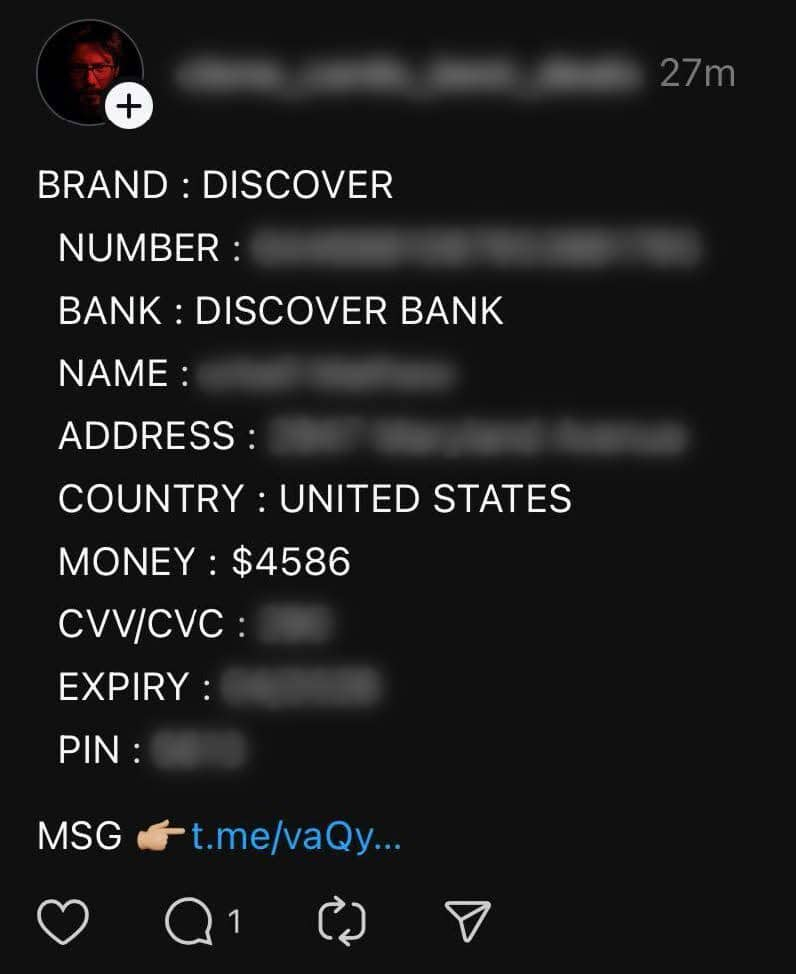 As we observe posts about stolen information shifting from Telegram to other more public-facing platforms like Threads, there is also the potential for more people to interact with and become interested in scams and financial fraud. Criminals are abusing mainstream social media applications to advertise stolen data, in this case by brazenly posting full stolen credit card data to the Threads app.