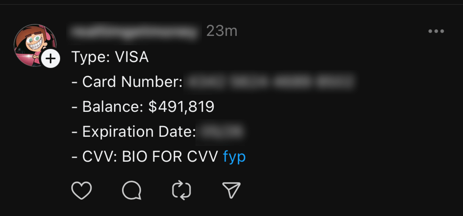 Screenshot of a post with stolen credit card information that contains “fyp,” an abbreviation of “For You Page.”