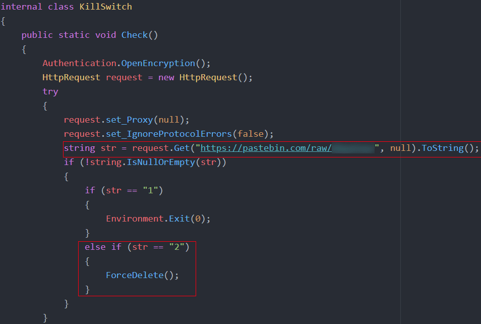 As soon as a user opens the application, the software runs “kill switch” logic to determine if the user may proceed. Essentially, the kill switch code provides the attacker with remote control over the application, including the ability to put the program into maintenance mode for all “customers” or even wipe it from all users’ systems.