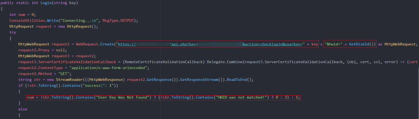 The program’s path of execution depends on the string stored in the pastebin paste. If the string is not empty, the code continues. If the string is greater than or equal to one, the program closes. This option is what we believe to be the maintenance mode, enabling the developer to perform maintenance on the licensing API.