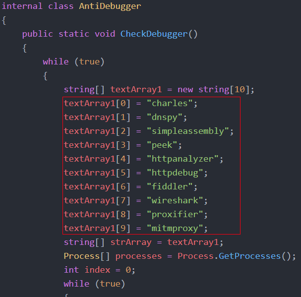 The Nintendo Checker software includes anti-debugging capabilities to discourage reverse engineering. Specifically, the application’s code checks for open processes looking for the account checker. For example, it detects Wireshark, an application used to analyze network traffic. If found, it triggers the kill switch and removes the software from the system.