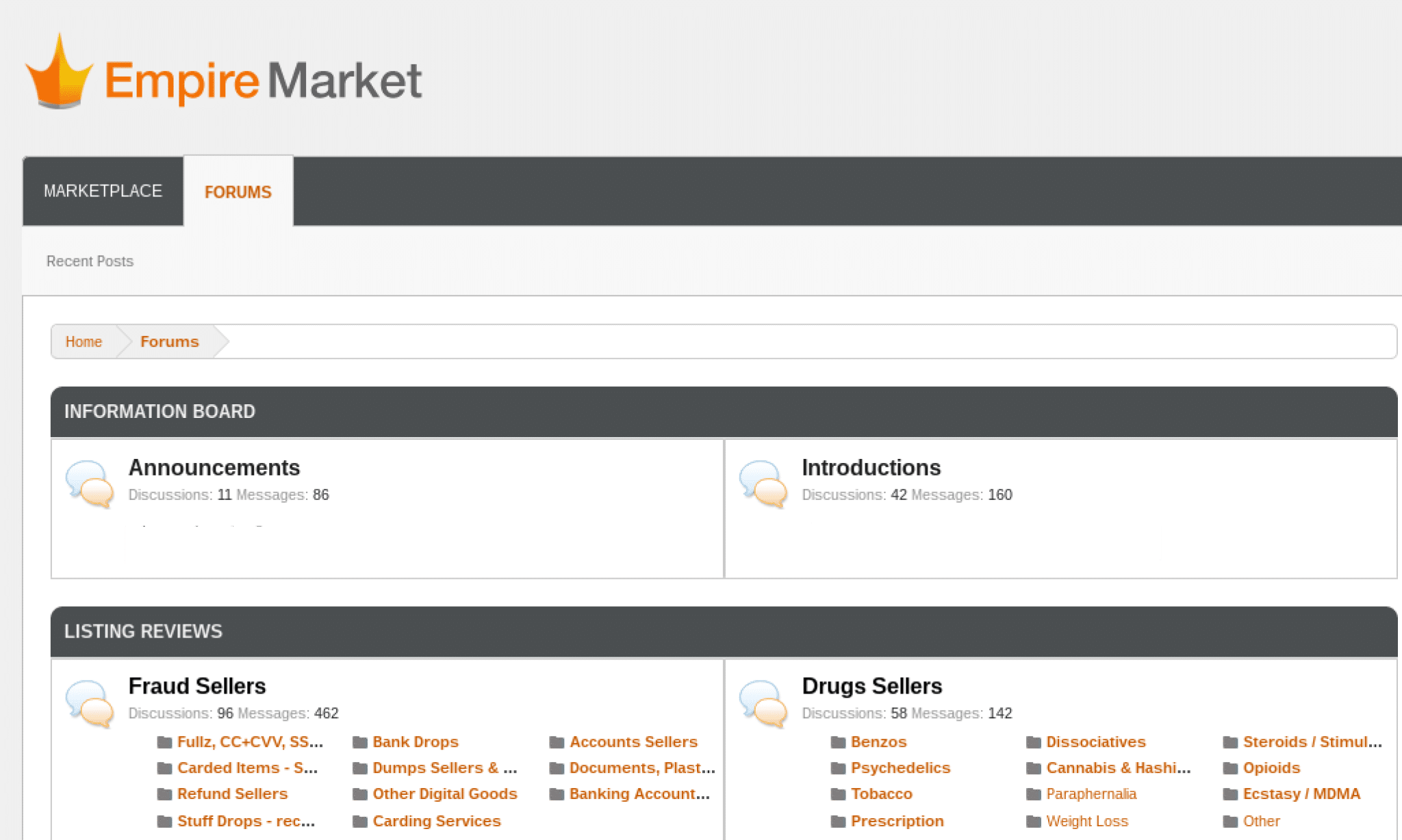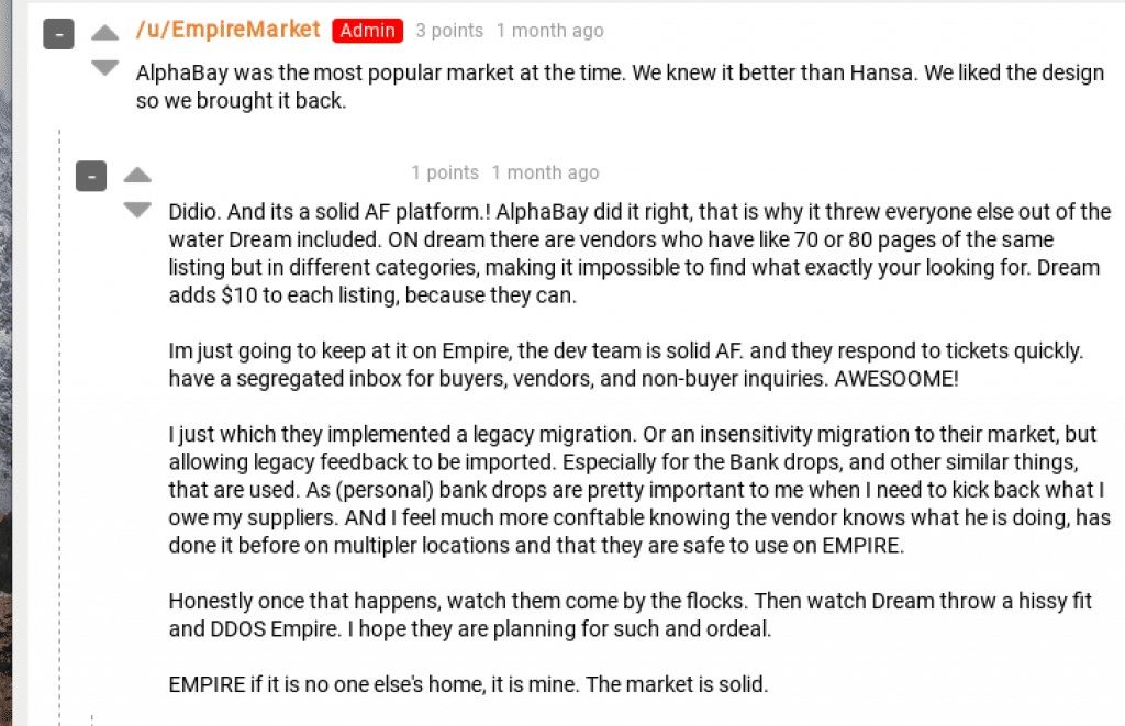 The Dread forum has a section dedicated to the Empire Market titled “Why did Empire choose to clone AlphaBay and not Hansa.”