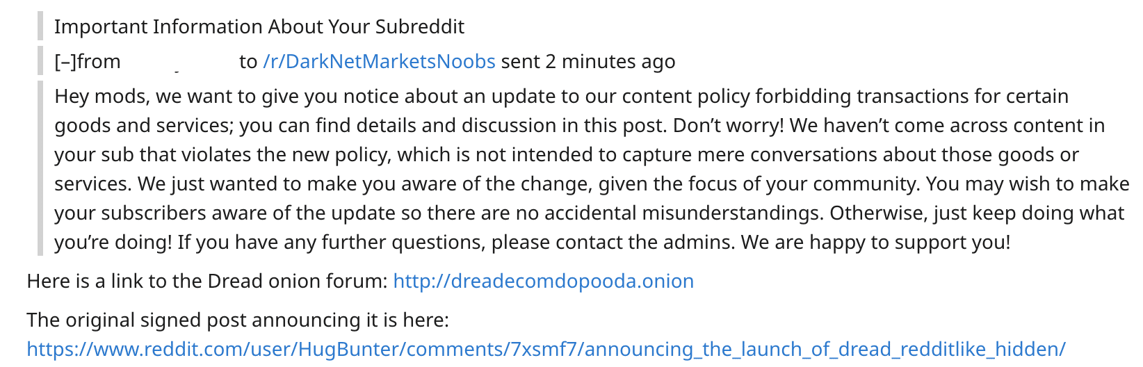 The post below, taken from Reddit, includes a link to the Dread onion forum and suggests Redditors who may violate Reddit’s new policies against the solicitation of forbidden goods do business there instead.