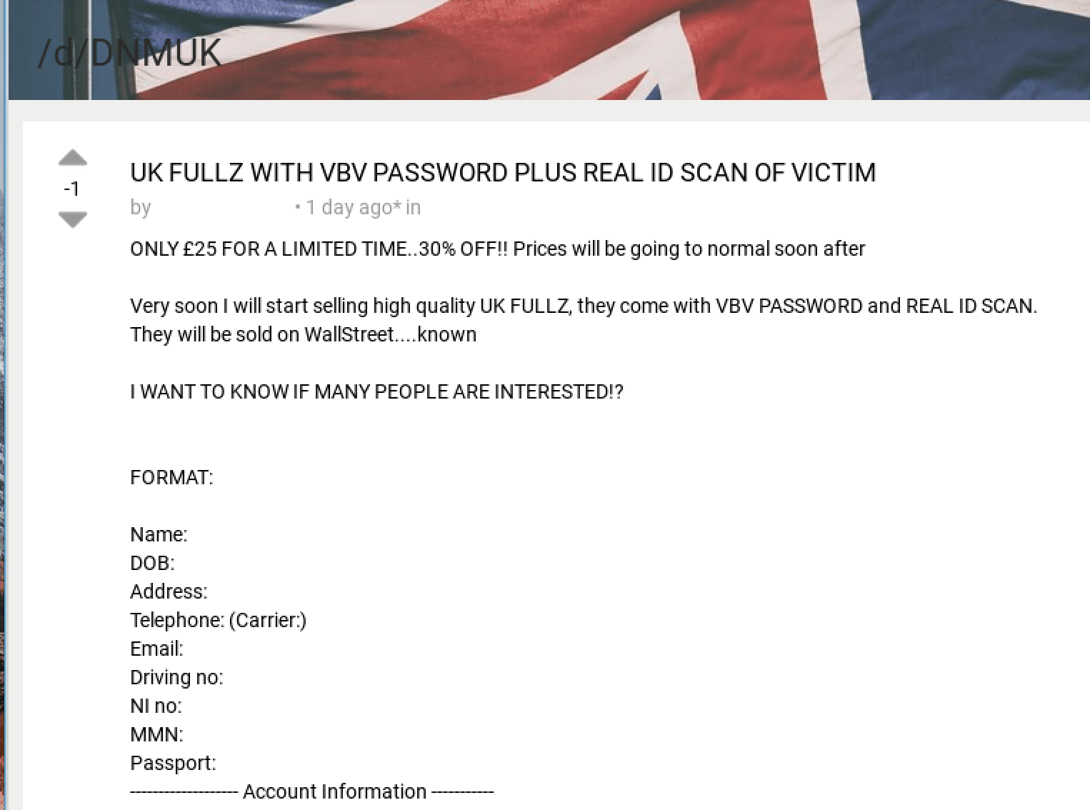 Some Dread members are attempting to sell their goods on Dread directly, although the site has a policy against such transactions. However, the new policy doesn’t forbid members from promoting their businesses on the site. The advertisement below, for UK fullz, prompts members to buy from him on the Wall Street Market, a smaller dark net market which is still operational after the seizures.