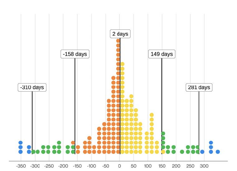 “Distribution of difference in days between ransomware posting and infostealer log discovery (n=503 – each dot is 2.52 ransomware victims)” sourced from page 57, 2025 Verizon DBIR.