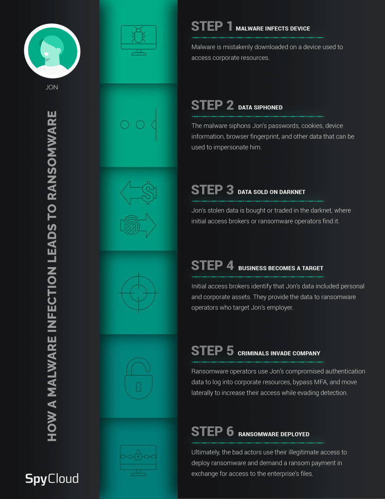 The path from a malware infection to a full-blown ransomware attack is short. Once malware infects a device, the data from that device is siphoned and then quickly used and/or bought or traded on the darknet from initial access brokers to ransomware operators as a form of guaranteed access.