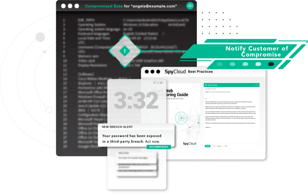 SpyCloud turns the tables by making darknet data work for you. We detect when stolen employee and customer identity data ends up in the hands of cybercriminals and automate remediation to reduce your risk of cyberattacks, including account takeover, ransomware, and fraud.