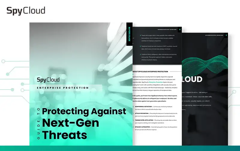 SpyCloud Employee Account Takeover Prevention helps enterprises safeguard corporate data, funds, and intellectual property by locking criminals out of corporate accounts. SpyCloud checks employee credentials against billions of recovered breach records in the SpyCloud database and alerts security teams to vulnerable accounts so they can take swift action to remediate them.