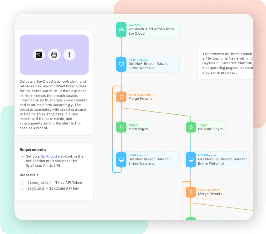Streamline your security operations by leveraging the power of SpyCloud’s recaptured darknet data in Tines pre-built Stories. Then combine Tines with other tools like ticketing systems, IAMs, TIPs, and EDRs to automate your security workflows and enhance your incident response process.