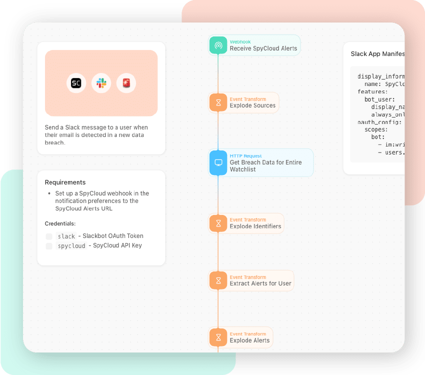 Automatically send a Slack message to a user notifying them when their email is detected in a new data breach published by SpyCloud. Trigger additional custom notifications that safeguard company data if SpyCloud’s publishes malware records from corporate devices and applications.