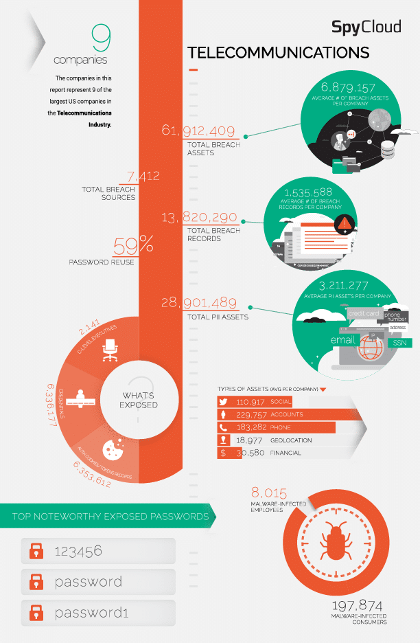 Recent SpyCloud research reveals that more than 6 million pairs of corporate email address + plaintext password pairs tied to Fortune 1000 telecommunications employees are available to cybercriminals. These can be easily used to gain access to corporate systems containing customer data, funds, and PII, perpetrate business email compromise, and then exploit reused passwords to gain entry into personal accounts.